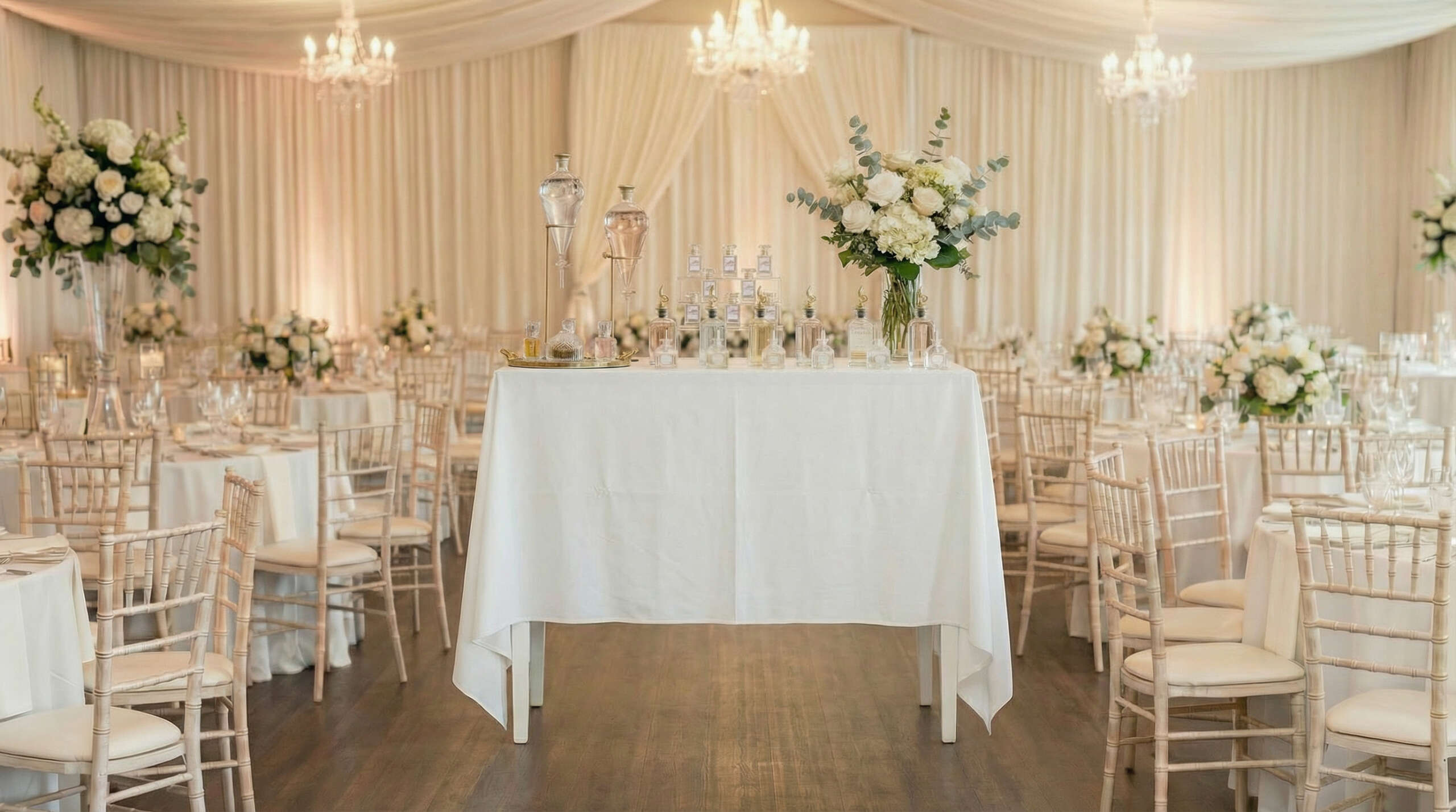 We have a 6-foot and 8-foot table, a perfume counter and a perfume cart. Clients choose based on their theme and decor and perfume-making style. The tables offer the most fragrance selections while the cart and counter, while elegant and exquisite, will offer fewer fragrance options for blending due to space constraints.