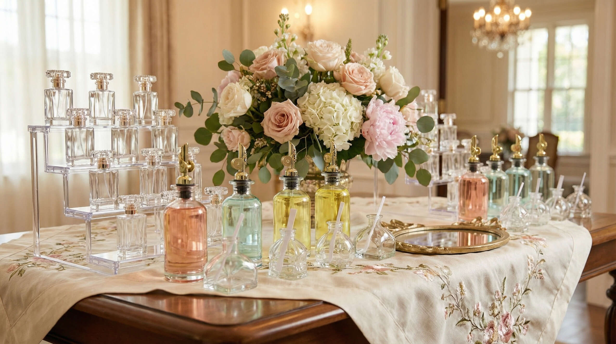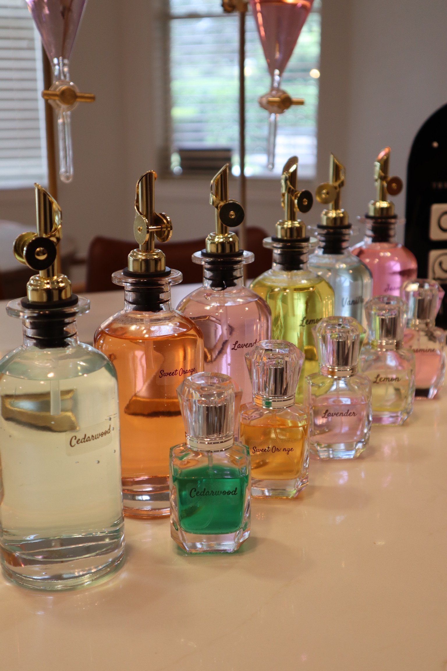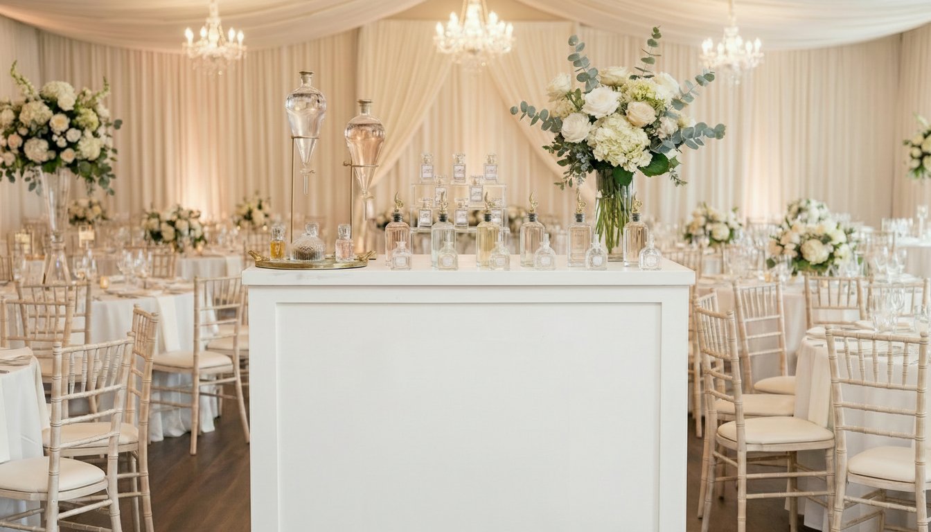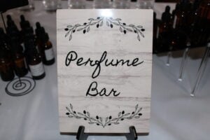 We have a 6-foot and 8-foot table, a perfume counter and a perfume cart. Clients choose based on their theme and decor and perfume-making style. The tables offer the most fragrance selections while the cart and counter, while elegant and exquisite, will offer fewer fragrance options for blending due to space constraints.