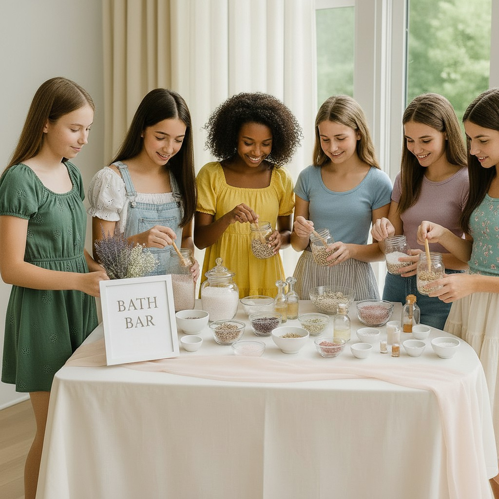 For tweens who love self‑care, cozy nights in, and spa‑style experiences, our Bath Bar is a perfect fit. Guests build their own bath soak or bath salts using curated ingredients like mineral salts, florals, and shimmer.