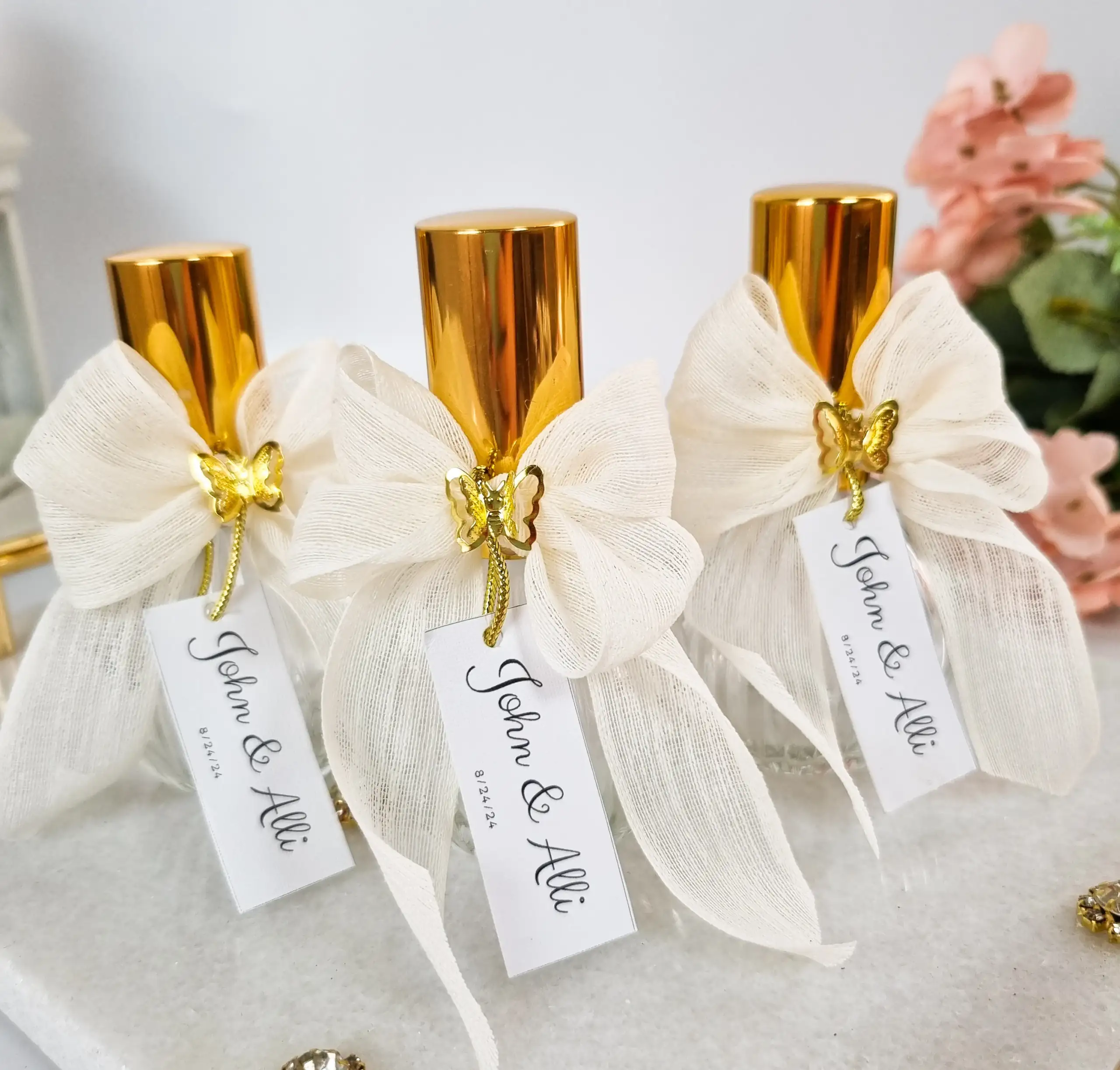 After styling and running the perfume bar at countless weddings, I’ve learned that the most impactful customizations are the ones that feel personal, intentional, and seamlessly tied to your wedding aesthetic. I always recommend choosing one statement element — like crystal bottles or a luxury linen — and pairing it with two or three subtle accents that elevate the entire presentation.
